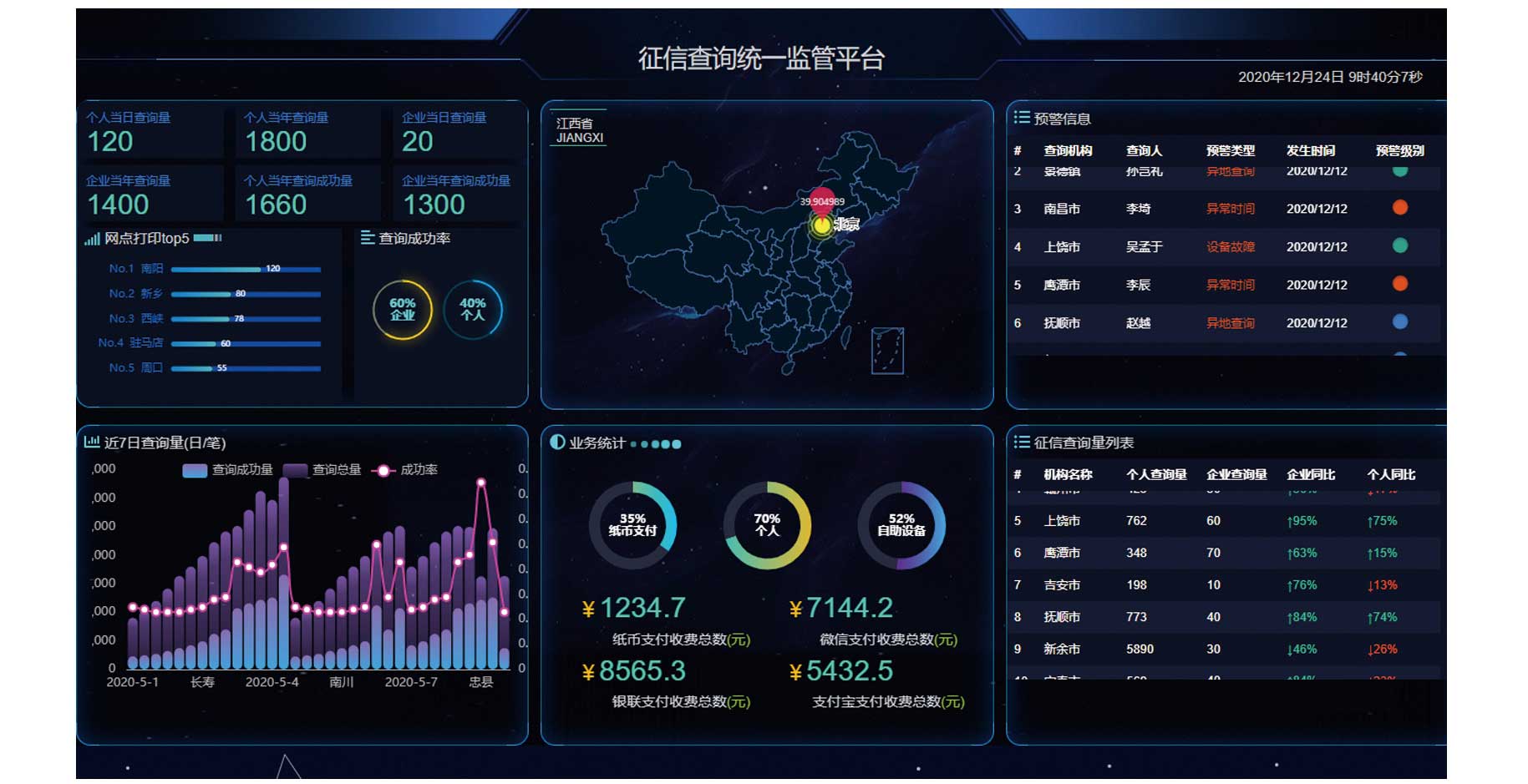 本平台旨在整合各自助查询机厂商和柜面前置系统,统一管理自助查询机和征信用户,规范自助查询机业务流程,为省人民银行分中心提供全省统一的征信用户管理、聚合支付接入及对账、全省设备管理、全省大屏监控预警、相关数据的综合统计与报表等功能。